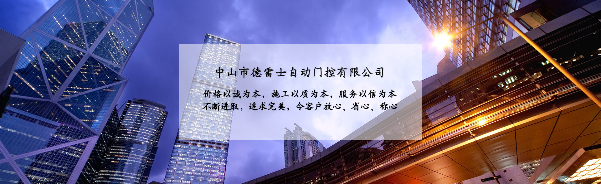 中山市德雷士自動(dòng)門控有限公司代理中山松下自動(dòng)門、中山松下感應(yīng)門、及其旗下品牌松下(Panasonic)自動(dòng)門、旋轉(zhuǎn)門、型材門、松下門禁系統(tǒng)、地彈簧、閉門器等系列產(chǎn)品。 松下Panasonic一直致力于憑借不斷創(chuàng)新的技術(shù)營造為各個(gè)區(qū)域的用戶做出最佳解決方案,在自身領(lǐng)域處于領(lǐng)先地位;松下自動(dòng)門控系統(tǒng)廣泛應(yīng)用于寫字樓、機(jī)關(guān)單位、大型企業(yè)、學(xué)校、醫(yī)院、智能小區(qū)等領(lǐng)域。在用戶心中有良好的口碑及信譽(yù)度。 松下(Panasonic)自動(dòng)門控系統(tǒng)包含:自動(dòng)感應(yīng)門、旋轉(zhuǎn)門、90度平開門、圓弧型門、重疊門、緊急逃生門、醫(yī)用門、氣密門、鋁合金型材門、松下門禁系統(tǒng)、家庭智能鎖、地彈簧、閉門器等系列產(chǎn)品。 德雷士自動(dòng)門控有限公司從事智能門控十余載,精英匯聚;公司具有完善的管理體系,對每位客戶都進(jìn)行檔案管理,跟蹤服務(wù),定期回訪,終生維修。提供急修12小時(shí)解決,一般維修48小時(shí)解決的服務(wù),完全能解決您的后顧之憂。 公司的質(zhì)量方針 科學(xué)管理確保的工程質(zhì)量 真誠服務(wù)贏得客戶信譽(yù) 持續(xù)創(chuàng)新打造企業(yè) 公司的服務(wù)宗旨 價(jià)格以誠為本,施工以質(zhì)為本,服務(wù)以信為本。 實(shí)實(shí)在在做人,老老實(shí)實(shí)做事,以我們的辛苦換來客戶滿意的微笑,這就是我們的追求! 公司的目標(biāo) ...